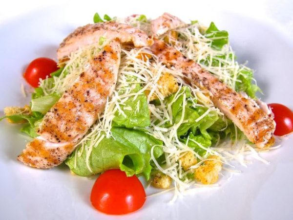 Куриное филе, сухари, лист салата, соус Цезарь, пармезан, помидор / 200 гр /