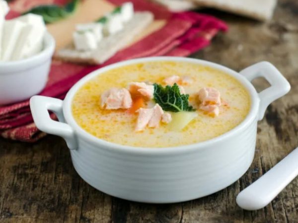 Овощной бульон, картофель , сливки, лосось, сухари /350 гр